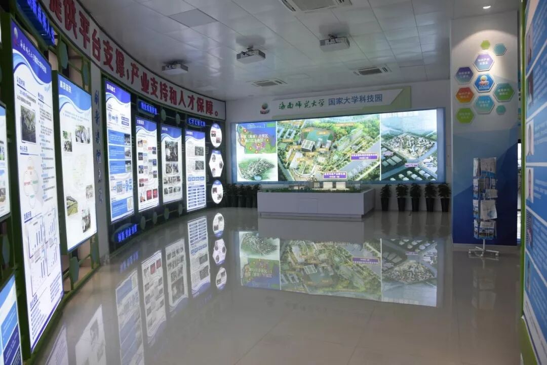 科技园展厅是科技园历年工作成果的直接展示区域,包括创新创业人才培养、企业团队孵化、产教融合、科技成果转化、扶贫工作、服务模式、大赛风采、建设规划等一系列工作成果展示,辅以介绍视频、规划沙盘的形式,使参观者一目了然。截止目前,已引进工商注册入园的企业共250家,其中省内外高校科研院所师生创办企业共121家;在海南省股权交易中心挂牌企业累计8家;培育高企7家;入驻研究机构、企业研发中心39家;与高校科研院所建立了产学研合作关系的企业63家;帮助企业转化科技成果28项;引进入孵人才项目61个,其中千人计划1个,万人计划2个,杰出人才项目3个,领军人才项目1个,拔尖人才项目1个;帮助企业申报知识产权累计103项;帮助基地企业获得投融资近6000万元;为社会提供工作岗位累计1700余个;建设校企合作大学生实习实践基地20个;辅导企业/团队获得省级以上创新创业大赛获奖项目累计46个;为师生和企业开展创新创业实践周、项目路演会、知识产权讲座、创梦训练营等各类培训累计640场次,培训创新创业人才20600多人次。组织园区企业在定安、琼海、白沙、五指山等地,积极开展产业扶贫,服务县域经济,惠及农户710多户。