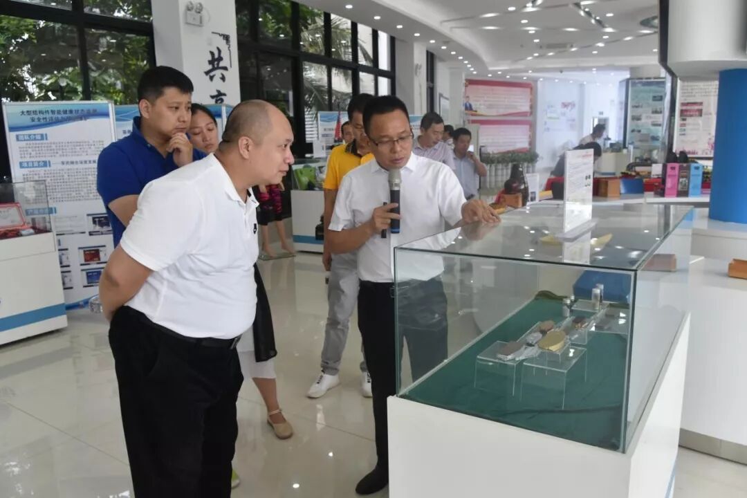 在园区负责人的陪同下,考察团一行来到科技园科研成果展厅、产品及交易展示厅进行参观,此处汇集了园区内众多高校师生团队成果转化产品及在孵企业自研产品及,半导体激光、石墨烯轮胎、可食用香皂等,以实物的方式立体化展示科技园工作成果。