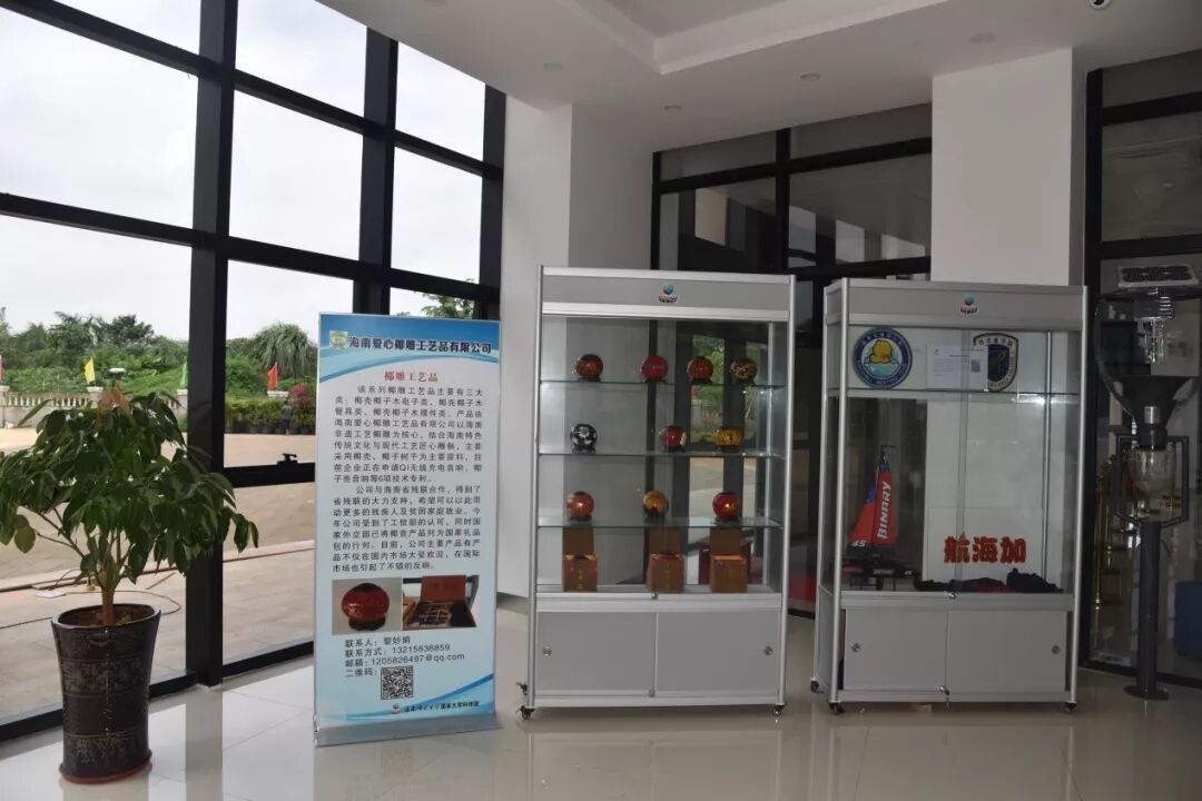 产品体验销售厅展示厅内以入驻企业团队自主研发产品为主,汇集了所有在孵及入驻团队的产品展示,参观者在此不仅可以近距离体验到如:传统椰雕工艺制品、橡胶草、可食用香皂、文创产品、3D打印工艺、辣木面等,还可以现场进行购买或与企业沟通合作,互利共赢。
